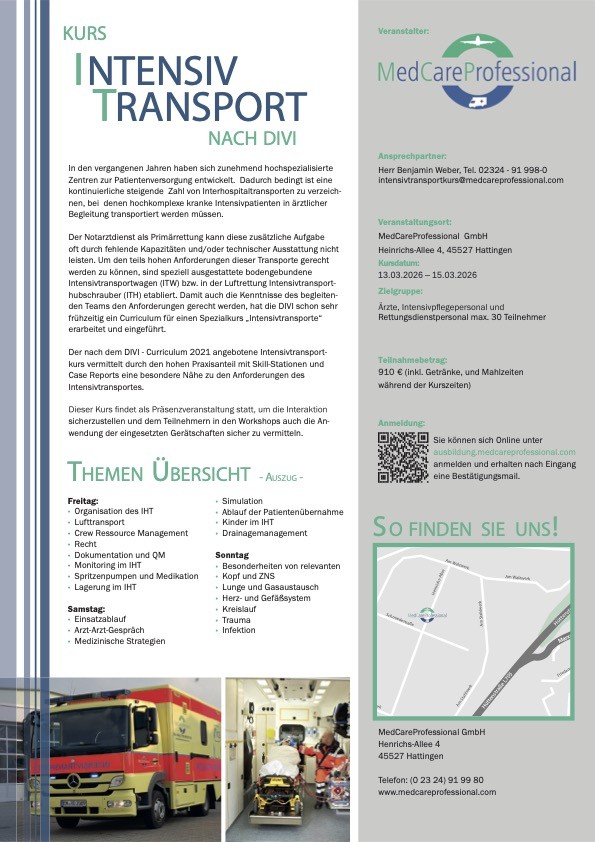 Der angebotene DIVI–Intensivtransportkurs vermittelt über die hier vorgeschriebenen Inhalte hinaus, in theoretischen, aber vor allem auch praktischen Trainingseinheiten und Hands-On, Kleingruppen-Simulationen und Einblick in aktuelle Medizintechnik, über die Anforderungen des Curriculums hinaus Kenntnisse und Kochrezepte - und gibt so routinierte Handlungsabläufe an die Hand.