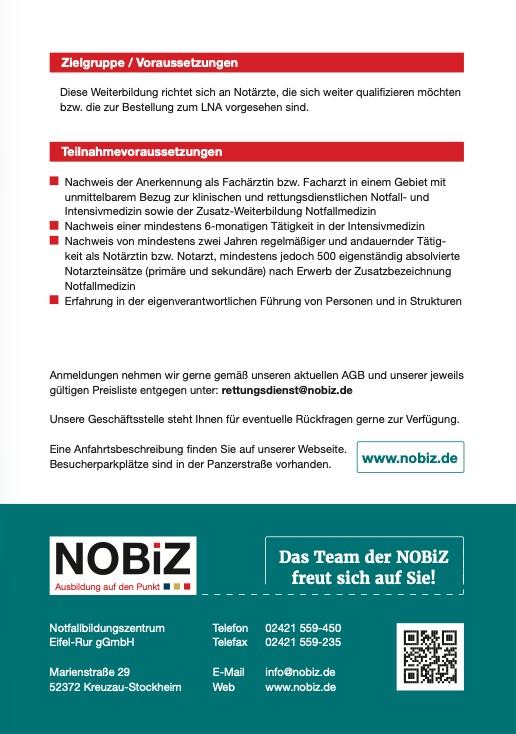 Zielgruppe: Notärzte, die sich weiter qualifizieren möchten bzw. die zur Bestellung zum LNA vorgesehen sind.