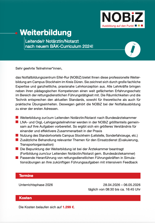 Leitende/r Notärztin/Notarzt; nach neuem BÄK-Curriculum 2024!