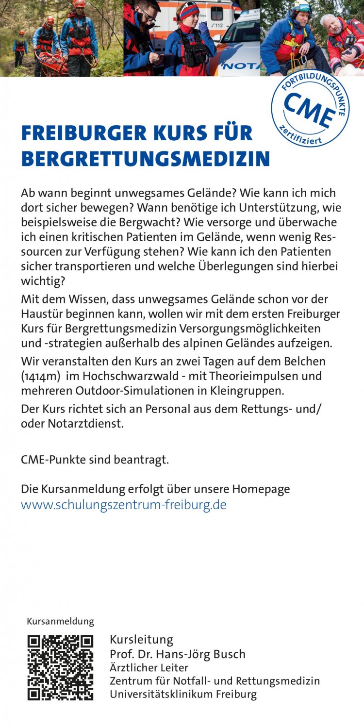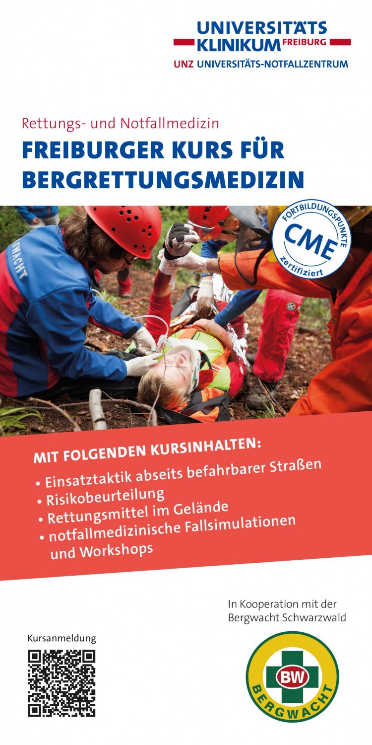 Gemeinsam mit unseren Kooperationspartnern veranstaltet das Schulungszentrum für Notfall- und Rettungsmedizin am jährlich den Freiburger Kurs für Bergrettungsmedizin, mit dem wir die Lücke zwischen der straßennahen Notfallversorgung und der alpinen Höhenrettung schließen wollen.