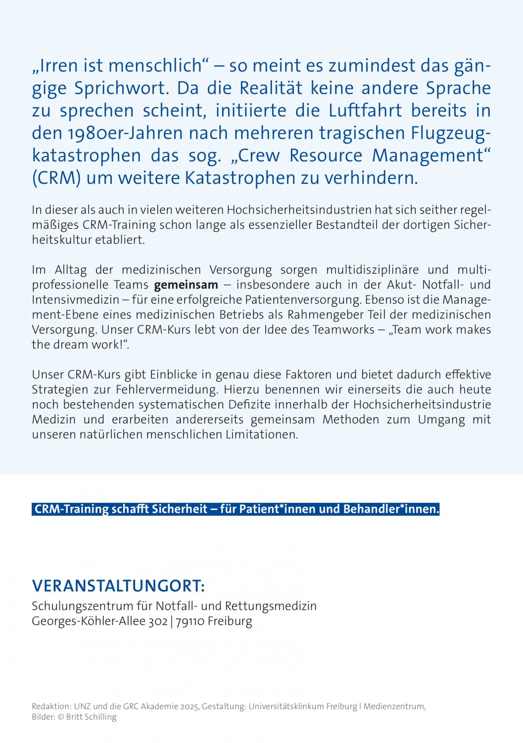 Auch in der Hochsicherheitsindustrie Medizin halten insbesondere in der Notfall- und Intensivmedizin Prinzipen aus den Human-Factors-Wissenschaften sowie CRM-Training zunehmend Einzug. Das Schulungszentrum für Notfall- und Rettungsmedizin veranstaltet ab Dezember 2025 einen zweitägigen CRM-Kurs.