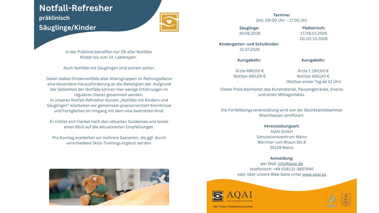 Notfall - Refresher, präklinisch: Thementag Kindergarten- und Schulkinder | Mainz | 21. Juli 2026 - 21. Juli 2026